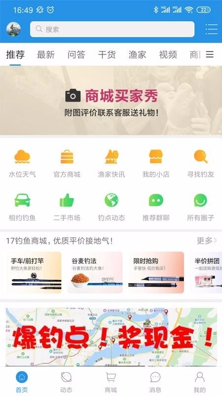 2、轻松找钓场、查渔讯、购钓具、交钓友、学钓技;
