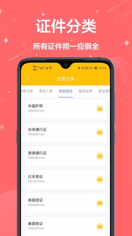 1、进入证件分类界面,多种类型的证件照任您选择制作