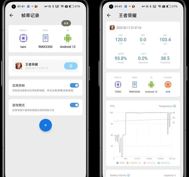 8.Scene5 - 场景5 - 功能 - 帧率记录,点击要测试的王者荣耀,就能查看帧率记录和曲线