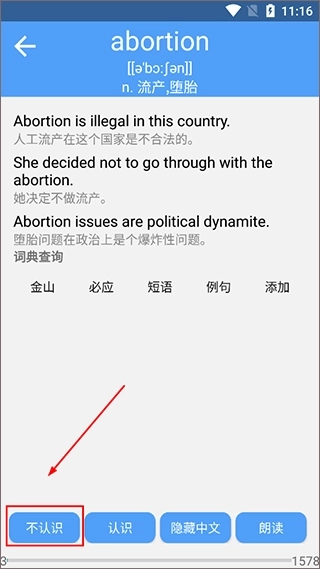 1、打开英语六级单词app进行单词学习时,若碰到陌生或不认识的单词,可在该单词页面点击【不认识】按钮,系统会自动将其添加至生词表中。