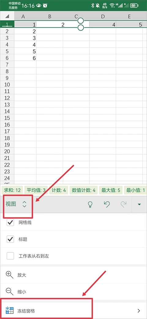 1、在表格中选中要冻结的行或列,然后在下方菜单栏中选择视图功能,并将页面下滑至冻结窗格