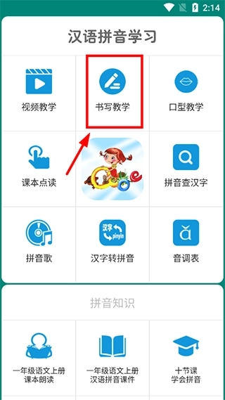 1、打开汉语拼音学习app,进入后点击【书写教学】板块;