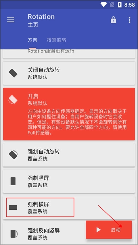 4、比如你要利用Rotation软件进行强制横屏,那么点击下“强制横屏”,再点击“启动”。