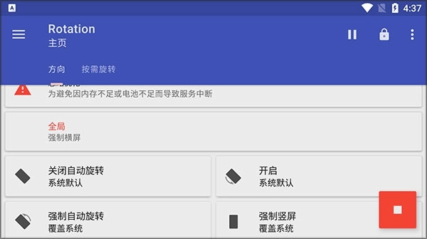 7、开启权限后即可进行横屏,然后点击右下方的按钮即可停止服务,又恢复默认方向。