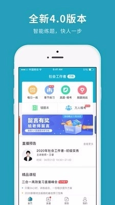 社会工作者快题库app是专为考试打造的专业题库应用,里面收录了海量题目资源,社会工作者考试相关的各类题目都能在这里找到。用户可以随时在线练题,多样化的练习模式能适配不同人的做题习惯,既能用来日常练习,也能模拟考试场景。更实用的是,app内设有名师直播课程,每次开课前会自动推送直播预告,方便大家准时进入课堂学习。除了做题练习,还能在线学习理论知识,丰富的考试课程可供自主选择,用户可以自由挑选课程,个人的所有课程也能集中管理。在这里,既能随时在线学习课程,又能进行题库练习,感兴趣的话就赶紧下载体验吧。