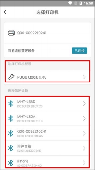 2、根据提示开启蓝牙功能,选择打印机型号,搜索打印机设备进行连接,成功连接时会显示“已连接”;
