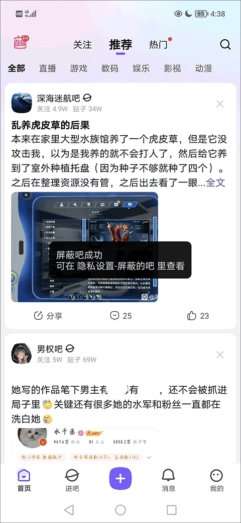 3、这样一来,用户就可以屏蔽这个贴吧的贴子了。