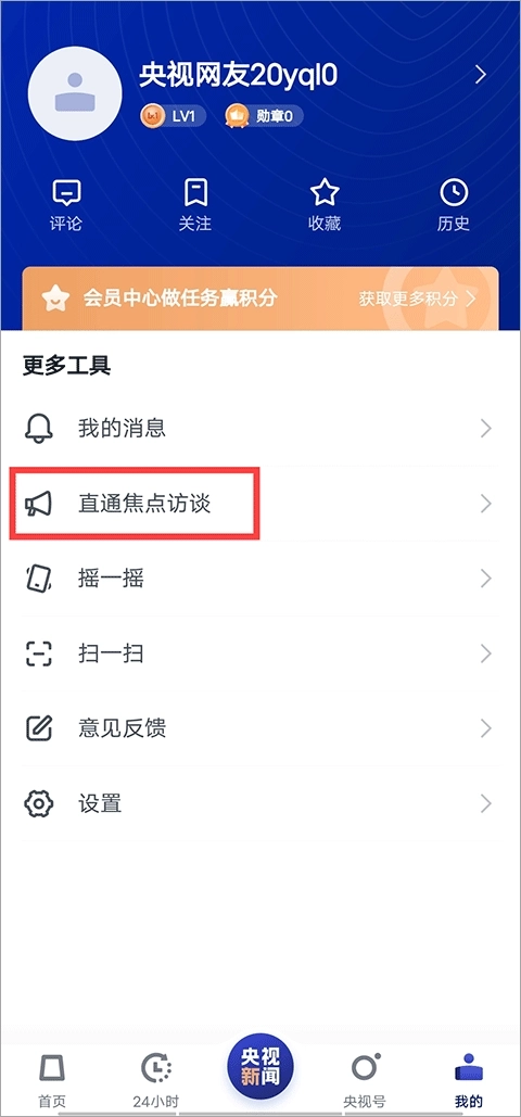 1、进到软件内后,点击我的界面,在界面的更多工具下方可以看到有一个“直播焦点访谈”