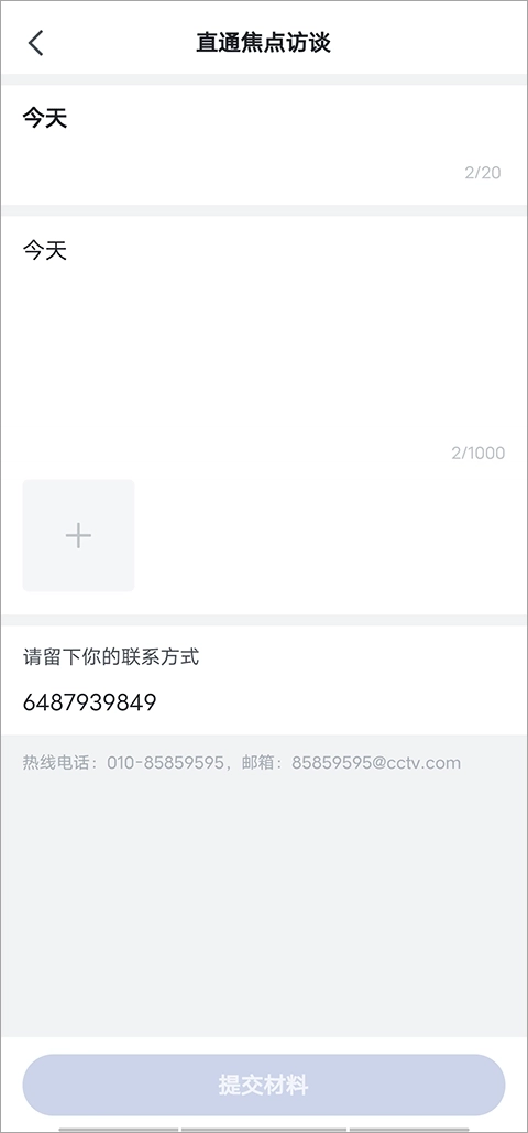 2、进到投稿界面后,输入标题、内容、还可以添加相关图片,以及你的联系电话后,点击提交材料即可投稿啦。