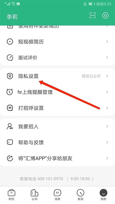 3、进入设置界面,滑动右边圆点,即可隐藏简历。