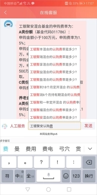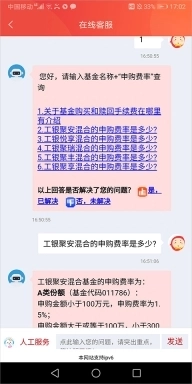其中申购费可参考上文,认购费、赎回费等其它手续费可以通过app客服页面输入基金名称+相关手续费用名称进行查询,例如下图所示在客服页面中输入”工银聚安认购费“就会出现相关具体产品的认购费查询功能了