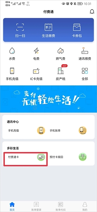 1、打开付费通app,在首页中点击付费通卡