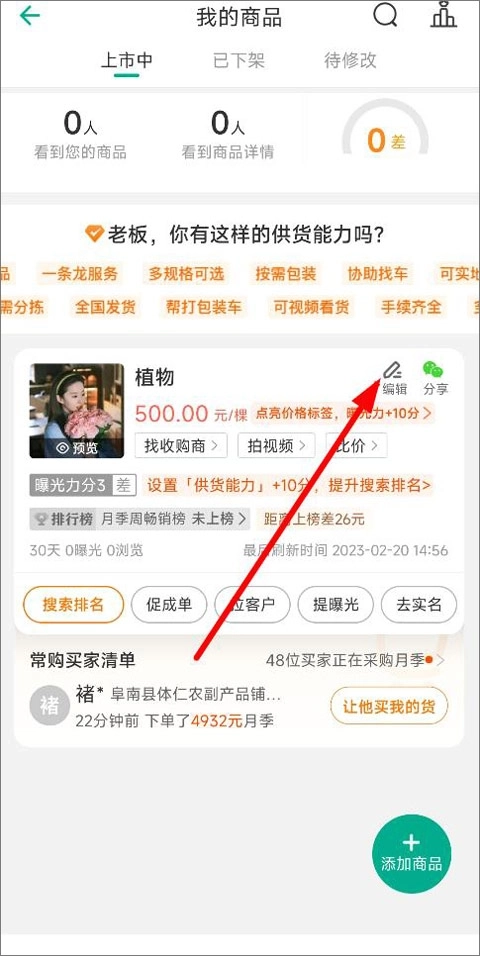 3、我的商品页面,用户可查看上市的商品、搜索排名等信息,点击右侧编辑;