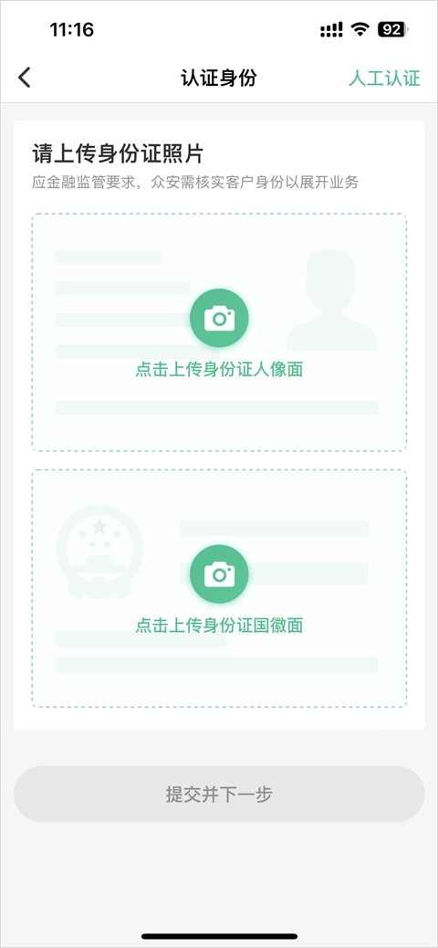 5、如果你选择“身份证照片”认证的话,就需要上次自己的身份证照片正反两面,完成之后点击提交并下一步就基本完成了。