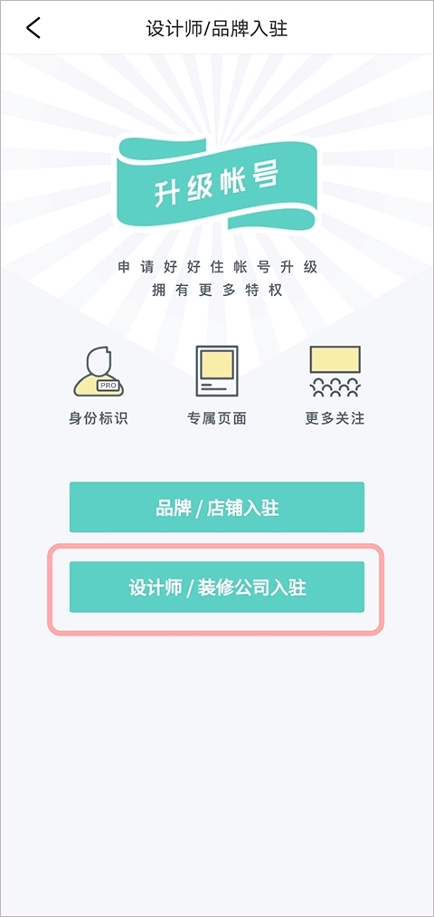 您好,您可以打开好好住APP,先找到“我的”页面,接着点击左上角的“更多”选项,然后选择“品牌/设计师入驻”,最后挑选您想要申请认证的身份,就能在线上完成申请啦。