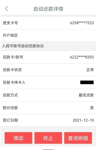 3、如果您的卡片已经开通自动还款,点击卡片进入详情页,可以查看还款协议内容,对自动还款协议进行修改和终止,以及查看自动还款明细。