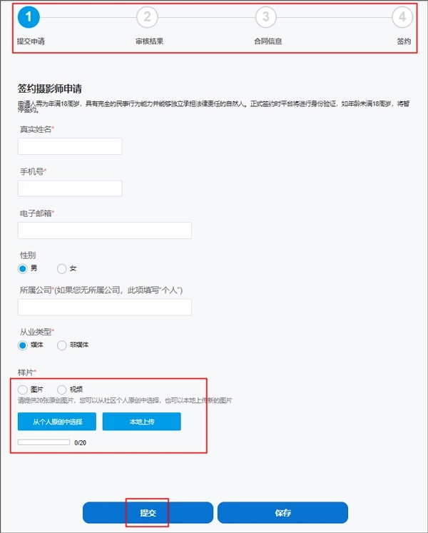 2、然后将自己的个人信息完善并提供20张原创图片,提交后等待审核通过后即可签约
