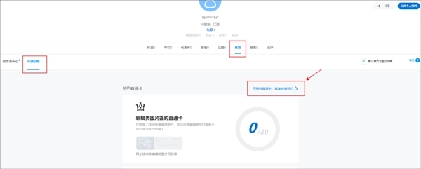 1、在500px中国版网页端中登录账号后在个人中心页面的售图中点击不等待直通卡,直接申请签约