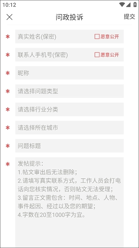 1、打开应用,在投诉建言板块填写完个人信息后,找到并点击右上角的“提交”按钮;