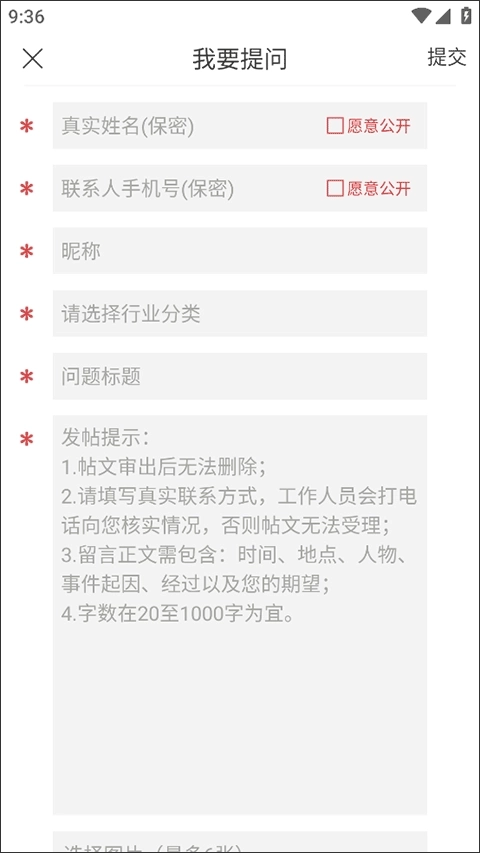 3、接着,在“我要提问”界面中,依次填写真实姓名(可公开)、手机号(可公开)、昵称、行业分类、问题标题、问题内容等必填信息,之后找到并点击右上角的“提交”按钮,就能完成提问操作。