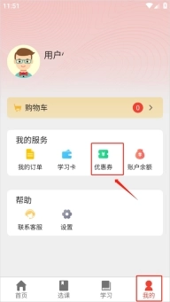 1、在“我的”页面选择“优惠券”。