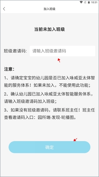 2、关于输入班级邀请码的操作,首先需要确认孩子所在的幼儿园是否已加入咏威亚太体智能服务体系。若幼儿园已加入该体系,家长即可直接输入邀请码来绑定对应的班级。