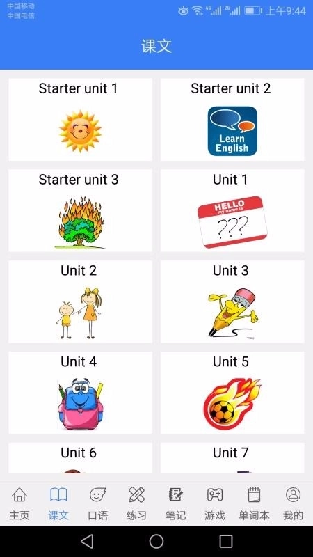3、在课文界面,可以根据需要自由选择单元内容进行学习的开展