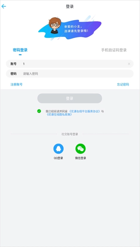 1、首先打开优课在线app进行账号登录,无账号的小伙伴可以进行注册;