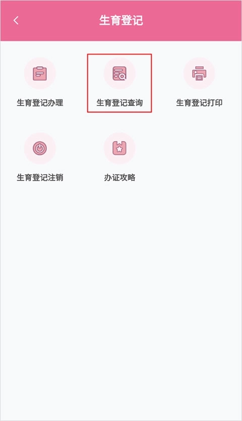 1、先在首页找到并点击【生育登记查询】按钮,页面会跳转至子女生育登记证查询界面,接着在该界面选择“生育登记查询”选项即可。