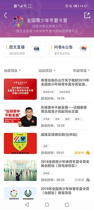 要是对夏令营这类活动感兴趣,这款软件里也能找到相关内容。软件内包含各种各样的青少年体育冬夏令营,汇聚了足球、篮球、露营、登山、航模等各类体育项目的冬夏令营,种类十分丰富,应有尽有。