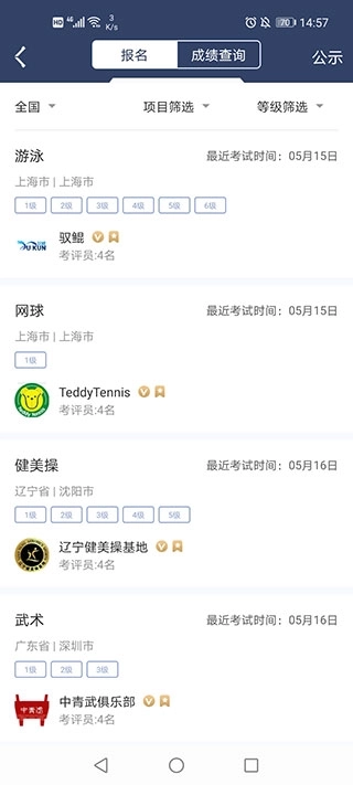 3、点击青少年等级,里面有各种各样的项目报名考试,更是有成绩查询等