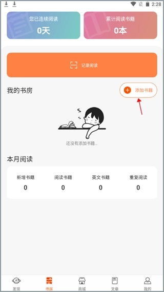1、启动软件后,点击底部菜单栏中的“书房”选项,接着选择“添加书籍”功能。