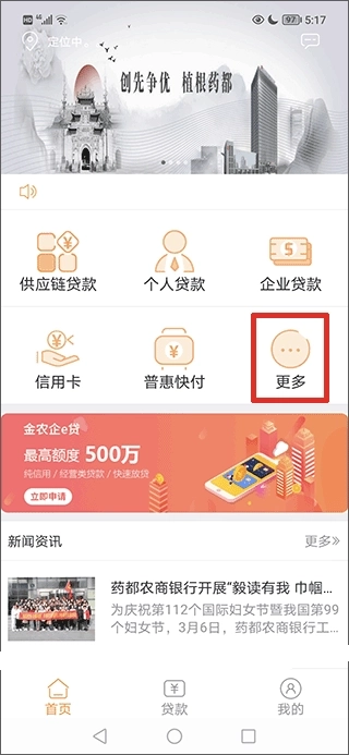 1、打开药都农商行手机银行app,在首页找到并点击“更多”按钮;