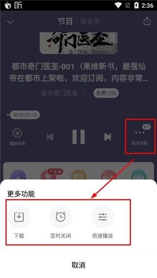 5、选择更多功能,可以开启下载、定时关闭、倍速播放等,自由设置