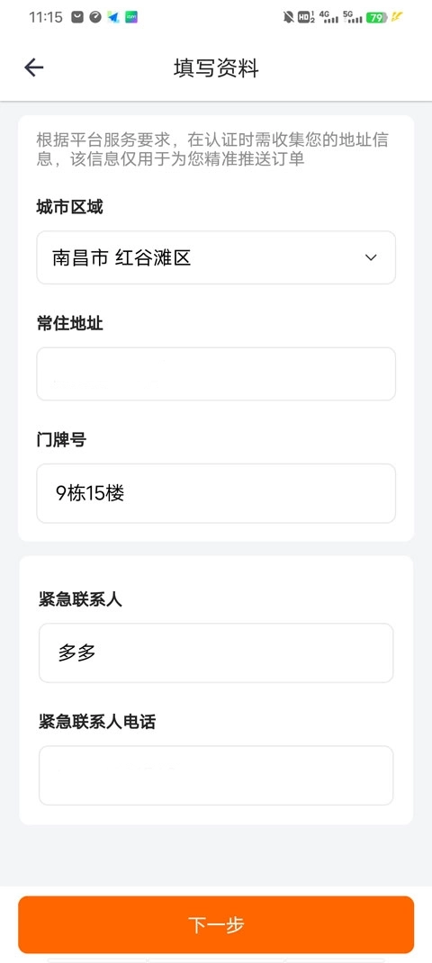 3、输入详细常驻地址,紧急联系人及其电话,点击下一步;