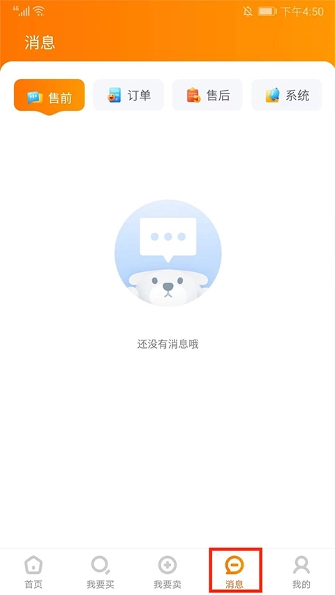 5、在【消息】界面,可以查看售前、订单、售后和系统的消息,了解最新动态,
