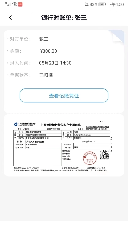 3、选择相应的记录可看到单位、金额、录入时间、单据状态和记账凭证等详细信息,