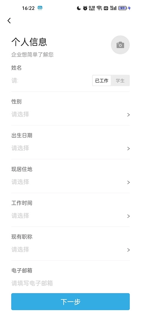 3、选好后点击下一步,接着会进入个人信息页面,需要填写个人信息、现有职称和电子邮箱,之后再点击下一步;