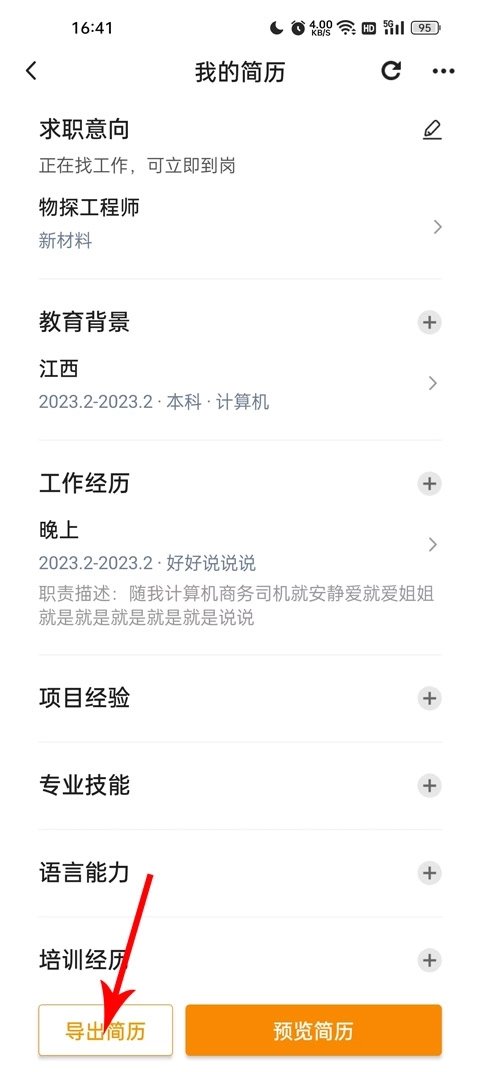 当我们完善简历资料之后,如何将其导出呢?教程如下: