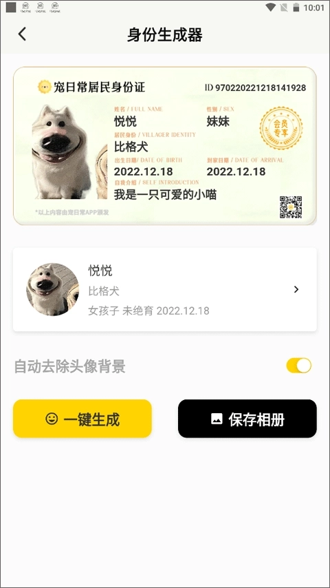 (2)上面显示的是宠物的居民身份证,下方有两个功能按钮:一键生成、保存相册,点击选择你要生成身份证的宠物信息,然后按下一键生成。