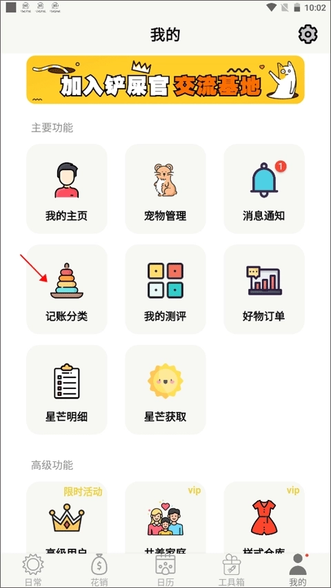 (1)如果软件里面没有你要记录的分类,可以选择【我的】-主要功能-记账分类。