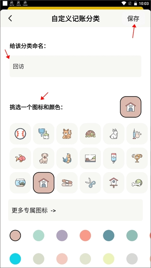 (3)给分类命名一个名字,挑选一个图标和颜色,弄好后点击保存即可添加成功。