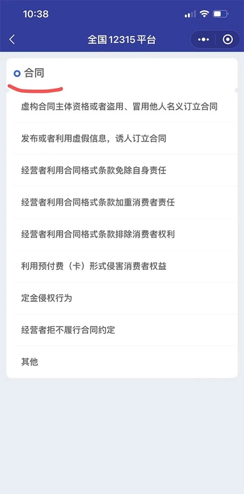 3、投诉问题类型的选择:投诉问题分类很详细,每个项目下面还有更加细分的小项,例如选择“合同”,下面还会出现具体的分类,我的问题涉及的是“利用预付费(卡)形式侵害消费者权益。