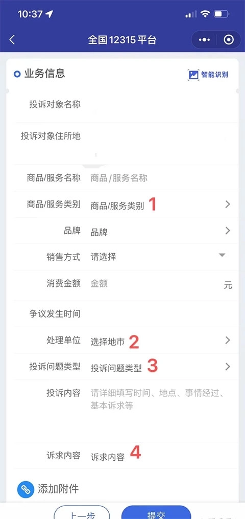 单独标注了4个位置,需特别注意一下;同时在最后是可以进行添加附件,如有相关证据最好是将相关信息添加上,进行佐证,有利于有关部门了解详情尽快处理。