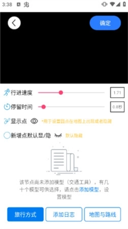 2、点击“生成轨迹视频”后还需要设置生成视频的行进速度以及各个落脚点的停留时间。交通工具模型、日志、地图路线显示等多项内容都支持用户自定义设置,我们可以自行选择设置