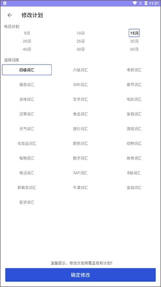 2、按照自己的实际需求挑选每日背词数量和对应的词库,选好之后,点击【确认修改】按钮就可以了