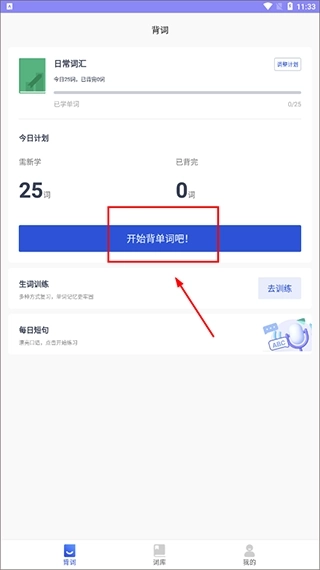 3、回到首页后,点击【开始背词】按钮,就能进入每日计划开始学习了。