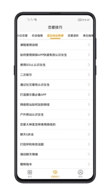 恋爱技巧是一款专为单身用户设计的恋爱学习工具,包含海量实用的恋爱技巧内容。用户可以在这里自由学习,了解不同的恋爱方法,学习如何与心仪的人沟通交流。它就像一本实用的恋爱指南,能帮助大家掌握更多高情商的沟通话术,让你在和喜欢的人交谈时更加得心应手。