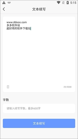 打开AI续写界面,输入想要续写的文字内容,接着确认好需要续写的字数,最后点击页面底部的【文本续写】按钮即可完成操作。