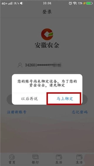 8、在新手机上打开安徽农金银行APP,输入身份证号和登录密码后点击【登录】,页面弹出窗口时点击【马上绑定】。